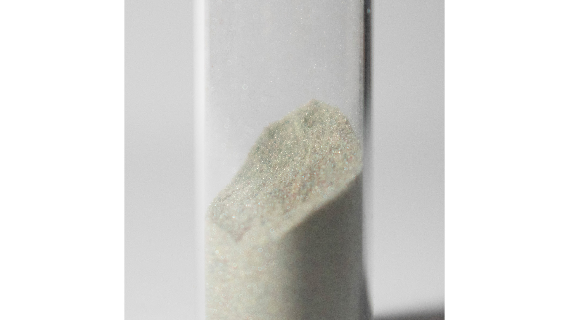 Une poudre grise est contenue dans un récipient en verre. Lorsqu’ on se rapproche on distingue une multitude de reflets colorés.